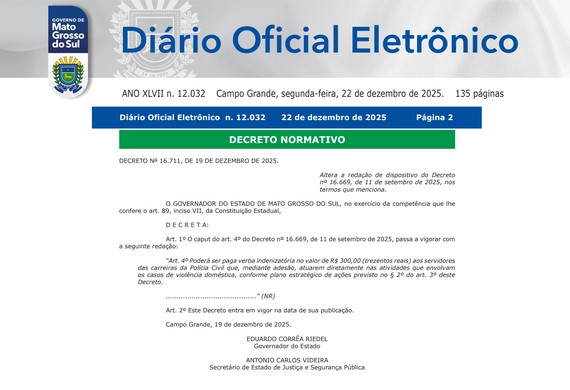 O Governo do Estado de Mato Grosso do Sul publicou no Diário Oficial Eletrônico desta terça-feira (22) o Decreto nº 16.711, de 19 de dezembro de 2025, que altera a redação de dispositivo do Decreto nº 16.669/2025 e autoriza o pagamento de verba indenizatória aos servidores da Polícia Civil que atuam diretamente em casos de violência doméstica.