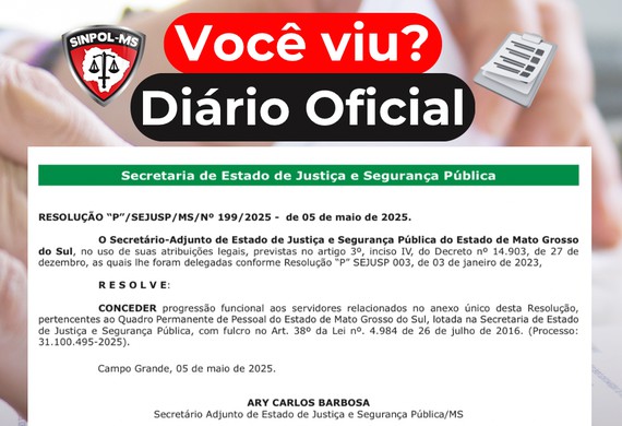 O Diário Oficial do Estado desta quarta-feira (07) trouxe a publicação da resolução que concede progressão funcional a policiais civis de Mato Grosso do Sul, com fundamento no Artigo 107 da Lei Complementar nº 114 de 19 de dezembro de 2005 e Resolução “P” SEJUSP nº 152/16, de 02 de maio de 2016.