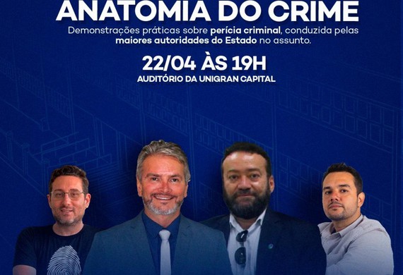 A Unigran Capital realiza no dia 22 de abril, às 19h, no auditório da instituição, a palestra "Anatomia do Crime", um evento que promete trazer uma abordagem prática e aprofundada sobre os procedimentos de perícia criminal. Com a presença de renomadas autoridades da área, a atividade marca a abertura da Pós-Graduação em Perícia Criminal e reforça a importância da qualificação técnica voltada especialmente para profissionais da Polícia Civil de Mato Grosso do Sul.