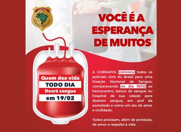 Sinpol convoca policiais civis para doação de sangue nesta quarta-feira