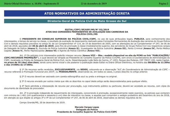Os policiais civis não aptos para a promoção poderão interpor recurso no prazo de 10 dias úteis, tendo como termo inicial o dia posterior à publicação do Edital. O recurso deve ser direcionado ao presidente do Conselho Superior da Polícia Civil/MS, com envio à Coordenadoria de Administração do CSPC, via Sedex ou pessoalmente.
