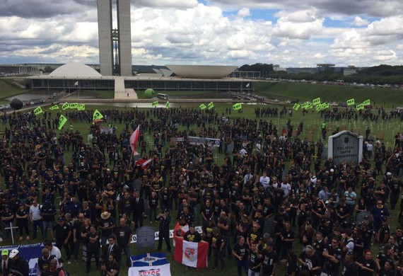 Cerca de 10 mil policiais de todo país se reuniram em frente ao Congresso Nacional na tarde desta quarta-feira, 08. A concentração começou por volta das 13h30 com o pronunciamento do presidente da Cobrapol, Jânio Gandra. Vários deputados federais também estiveram na manifestação e expressaram apoio à luta da categoria contra a PEC-287, da Reforma da Previdência, que retira o direito de aposentadoria dos policiais.