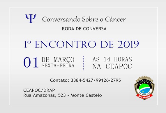 A CEAPOC convida os policiais civis interessados a participarem do “1º Encontro de 2019”– Conversando sobre o Câncer. O encontro acontecerá na sexta-feira (1º), às 14hs, na sede da CEAPOC, localizada na Rua Amazonas, nº 523 - bairro Monte Castelo.