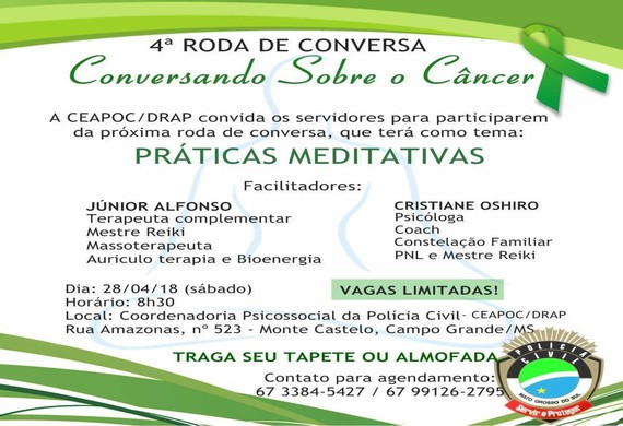 A Coordenadoria de Atendimento Psicossocial da Polícia Civil - CEAPOC/DRAP, visando o bem estar dos Policiais Civis e familiares que estão em tratamento de câncer, convida para a 4ª Roda de Conversa “Conversando sobre o câncer” com o objetivo de compartilhar experiências e dialogas sobre o tema. Será no dia 28 de abril (sábado), às 8h30, na sede da CEAPOC/DRAP, localizada na Rua Amazonas, nº 523, bairro Monte Castelo em Campo Grande.