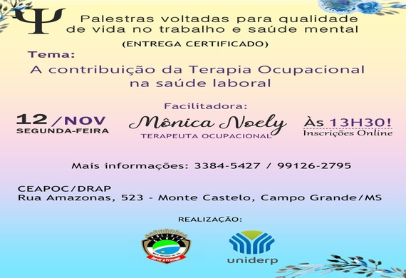 A CEAPOC convida os policiais civis para participarem da Palestra – “A contribuição da Terapia Ocupacional na saúde laboral” que será realizada na próxima segunda-feira (12), às 13h30 na sede da Ceapoc em Campo Grande. As inscrições são gratuitas e devem ser feitas através da internet CLICANDO AQUI. Ao final do programa, será emitido um certificado de participação aos inscritos que cumprirem a carga horária exigida. Mais informações pelos telefones: 3384-5427 / 9 9126-2795.