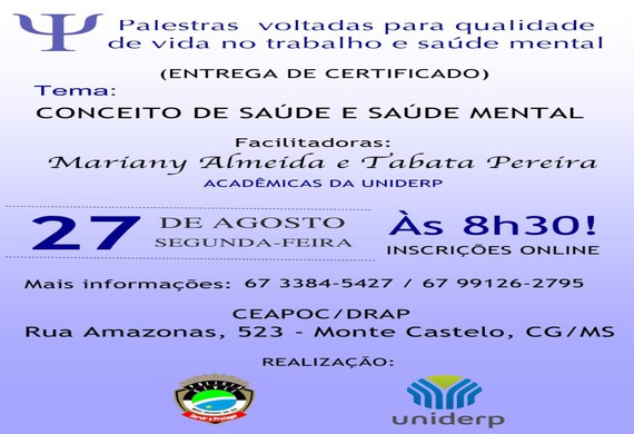 A Coordenadoria de Atendimento Psicossocial da Polícia Civil - CEAPOC/DRAP, convida para a palestra “Conceito de saúde e saúde mental”, com as facilitadoras Mariany Almeida e Tabata Pereira. Será no dia 27 de agosto, às 8h30, na sede da CEAPOC/DRAP, localizada na Rua Amazonas, nº 523, bairro Monte Castelo em Campo Grande. As inscrições devem ser feito por meio do site CLICANDO AQUI, também será entregue certificado de participação. Informações e agendamento pelo telefone (67) 3384-5427 / 9 9126-2795.
