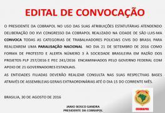 O PRESIDENTE DA COBRAPOL NO USO DAS SUAS ATRIBUIÇÕES ESTATUTÁRIAS ATENDENDO DELIBERAÇÃO DO XVI CONGRESSO DA COBRAPOL REALIZADO NA CIDADE DE SÃO LUIS-MA CONVOCA TODAS AS CATEGORIAS DE TRABALHADORES POLICIAIS CIVIS DO BRASIL PARA REALIZAREM UMA PARALISAÇÃO NACIONAL NO DIA 21 DE SETEMBRO DE 2016 COMO FORMA DE PROTESTO E ALERTA NÚMERO 3 À SOCIEDADE BRASILEIRA EM RAZÃO DOS PROJETOS PLP 257/2016 E PEC 241/2016 ENCAMINHADOS PELO GOVERNO FEDERAL COM APOIO DE 21 GOVERNADORES ESTADUAIS.
