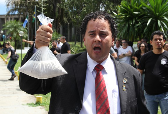 O vereador Wellington (PSDB), que é delegado da Polícia Civil, chegou há pouco na manifestação e levou um saco de cal, que chama de “Kit aposentadoria. “Isso significa o que os policiais vão receber quando se aposentarem, porque não vão chegar nem com vida”, sugeriu.