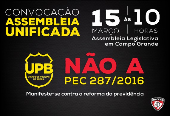 A UPB de Mato Grosso do Sul convoca a todos os trabalhadores da segurança pública, para no dia 15/03 (quarta-feira), às 10hs, comparecerem na Assembleia Legislativa, para lutarmos contra a devastadora PEC 287/16, da Reforma da Previdência.