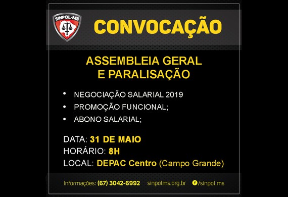 O Sinpol convoca toda a categoria para Assembleia Geral e Paralisação das Atividades, no dia 31 de maio, sexta-feira.