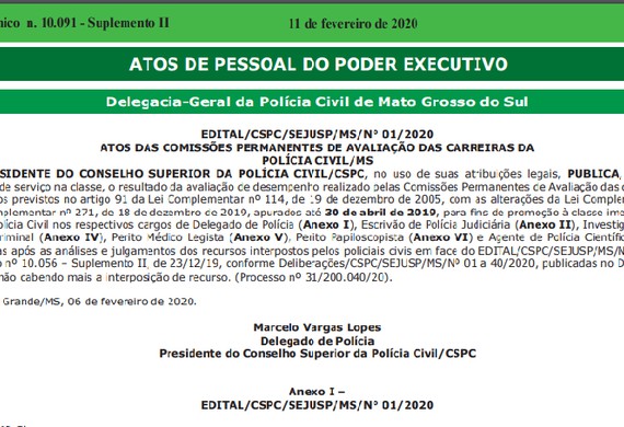O Diário Oficial 10.091 desta terça-feira divulgou o edital 01/2020 da Sejusp que traz o resultado da avaliação de desempenho realizado pelas Comissões Permanentes de Avaliação das carreiras do Grupo Polícia Civil para fins de promoção à classe imediatamente superior, dos servidores do Grupo Polícia Civil nos respectivos cargos de Delegado de Polícia, Escrivão de Polícia Judiciária, Investigador de Polícia Judiciária, Perito Criminal, Perito Médico Legista, Perito Papiloscopista e Agente de Polícia Científica, com as retificações processadas após as análises e julgamentos dos recursos interpostos pelos policiais civis em face do EDITAL/CSPC/SEJUSP/MS/N° 02/2019, publicado no Diário Oficial Eletrônico nº 10.056 – Suplemento II, de 23/12/19, conforme Deliberações/CSPC/SEJUSP/MS/Nº 01.