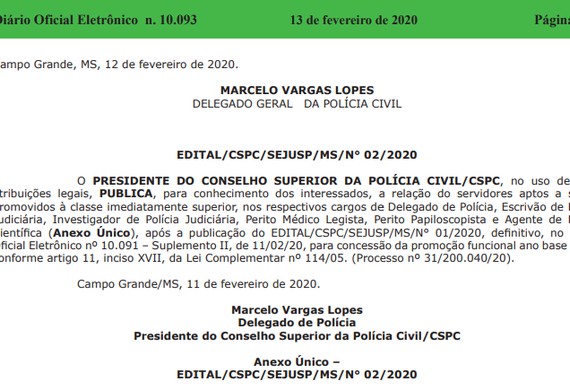 Foi publicado no Diário Oficial desta quinta-feira (13/02) o edital com a relação dos servidores aptos a serem promovidos à classe imediatamente superior para os cargos de Delegado de Polícia, Escrivão de Polícia Judiciária, Investigador de Polícia Judiciária, Perito Médico Legista, Perito Papiloscopista e Agente de Polícia Científica.