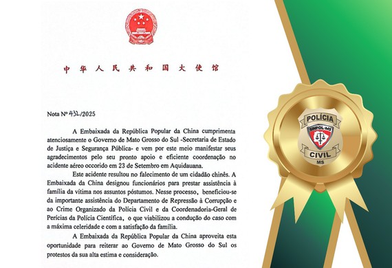 O Sinpol/MS destacou o reconhecimento oficial feito pela Embaixada da República Popular da China ao Governo do Estado, em especial à Secretaria de Justiça e Segurança Pública, pela atuação eficiente e coordenada nas investigações sobre o acidente aéreo ocorrido em 23 de setembro, em Aquidauana, que resultou na morte de um cidadão chinês.