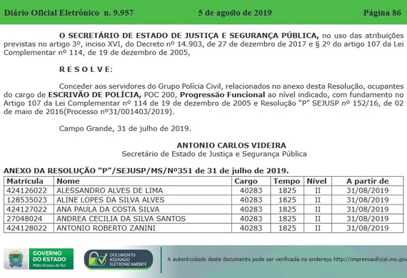 A lista completa com os nomes dos policais está no link: http://www.spdo.ms.gov.br/diariodoe/Index/Download/DO9957_05_08_2019
