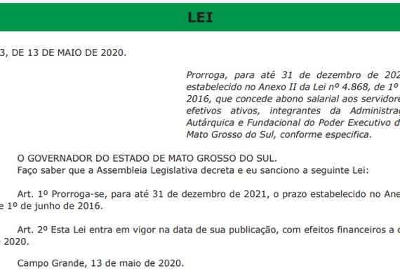 Foi publicada nessa quarta-feira (13), em edição extra do Diário Oficial do Estado, a Lei nº 5.503 que prorroga até 31 de dezembro de 2021 a concessão do abono salarial aos servidores estaduais efetivos ativos, integrantes da Administração Direta, Autárquica e Fundacional do Poder Executivo do Estado. A lei já está em vigor, com efeitos financeiros a contar de 1º de junho de 2020.
