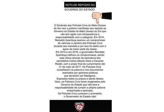 O Sinpol-MS publicou uma nota de repúdio ao Governo do Estado sobre o não cumprimento da Carta Compromissa e da falta de reajuste salarial da categoria. O texto foi veiculado nos jornais A Crítica (04/06), Correio do Estado e O Estado MS (05/06). A nota de repúdio também será veiculada em emissoras de televisão a partir desta terça-feira (06).