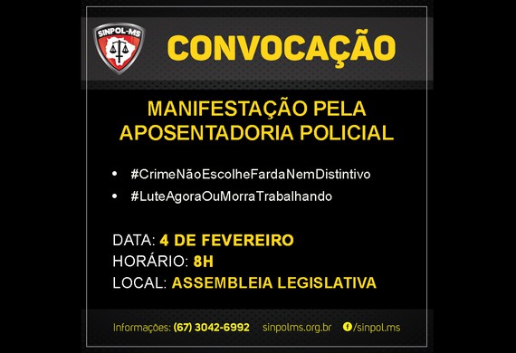 Amanhã, dia 4 de fevereiro de 2020, a partir das 8h, haverá uma grande manifestação em frente à Assembleia Legislativa de Mato Grosso do Sul, na luta pela aposentadoria Policial e pela aprovação do projeto para reposição das perdas inflacionárias. É de fundamental importância todos comparecerem “em massa”! Esta manifestação em frente à ALMS será aqui e nas Assembleias de todo o Brasil.