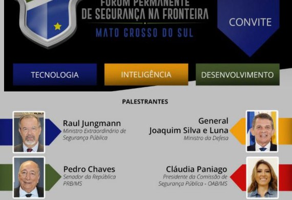 Será realizado no dia 19 de julho, das 8h às 12h, o Fórum Permanente de Segurança na Fronteira de Mato Grosso do Sul com o tema “Tecnologia, Inteligência e Desenvolvimento”. O evento, que é promovido pela OAB/MS, terá as palestras do Ministro Extraordinário de Segurança Pública, Raul Jungmann, do Ministro da Defesa, Geral Joaquim Silva e Luna, da Presidente da Comissão de Segurança Pública da OABMS, Cláudia Paniago, e do senador de MS, Pedro Chaves.