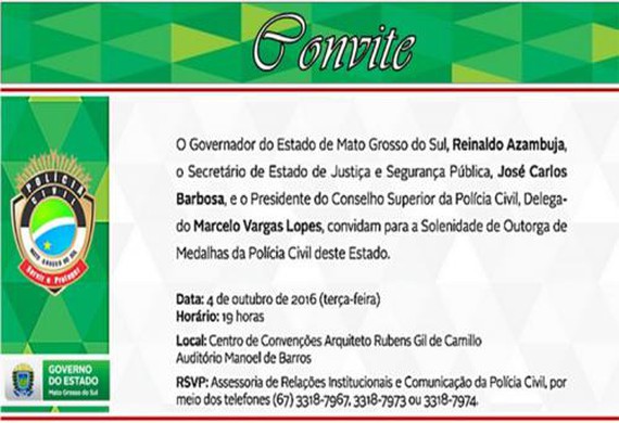 A Polícia Civil do Mato Grosso do Sul realiza na próxima terça-feira (4/10) a Solenidade de Outorga de Medalhas da Polícia Civil. O evento, realizado pelo Governo do Estado, Secretaria de Estado de Justiça e Segurança Pública e Delegacia Geral da Polícia Civil, acontece no Centro de Convenções Rubens Gil de Camillo – Auditório Manoel de Barros, às 19h.