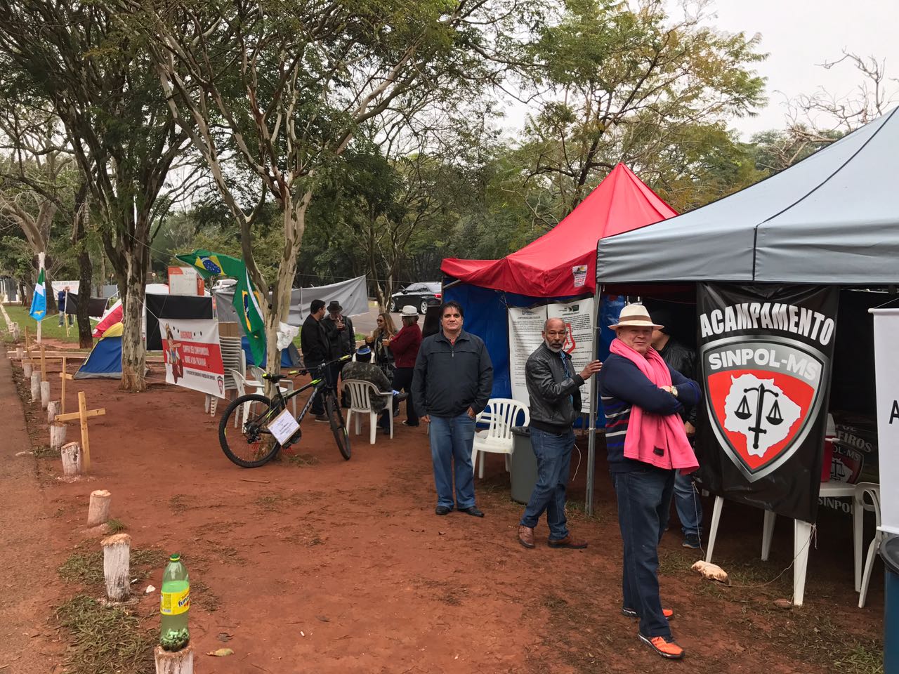 O Sinpol-MS montou uma escala de revezamento no acampamento para que o atendimento à população nas delegacias não seja prejudicado. “Estão participando colegas da capital e do interior demonstrando o seu descontentamento. Somente sairemos daqui quando o governador apresentar uma proposta que atenda a reivindicação da categoria”, destacou o presidente do Sinpol-MS, Giancarlo Miranda. O grupo está preparado para passar mais dias no local com tendas, barracas, banheiros químicos, gerador de energia elétrica e uma pequena cozinha.