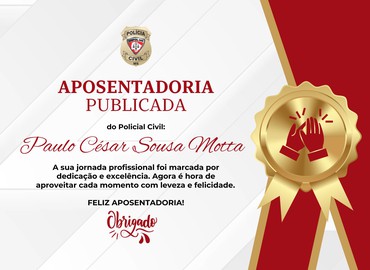 Foi publicada na última segunda-feira (6), no Diário Oficial n° 12.118, aposentadoria do Investigador de Polícia Judiciária RUYMAR DOUGLAS MORALES RUIZ.