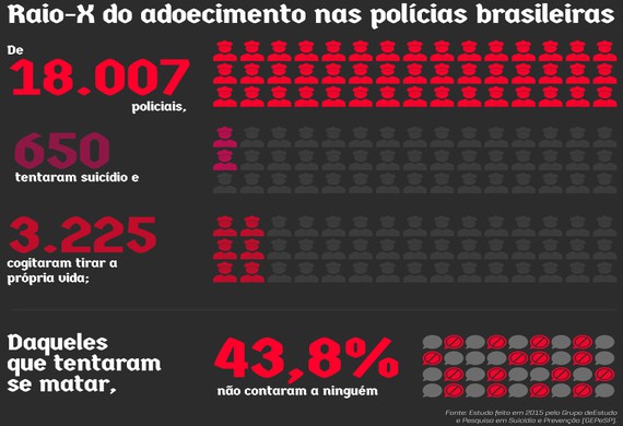 Em 2015, o Grupo de Estudo e Pesquisa em Suicídio e Prevenção (GEPeSP) entrevistou, por meio de um questionário on-line, 18.007 policiais de diversas instituições em todo território nacional. Desse total, 3.225 já haviam cogitado se matar e 650 chegaram a tentar suicídio.
