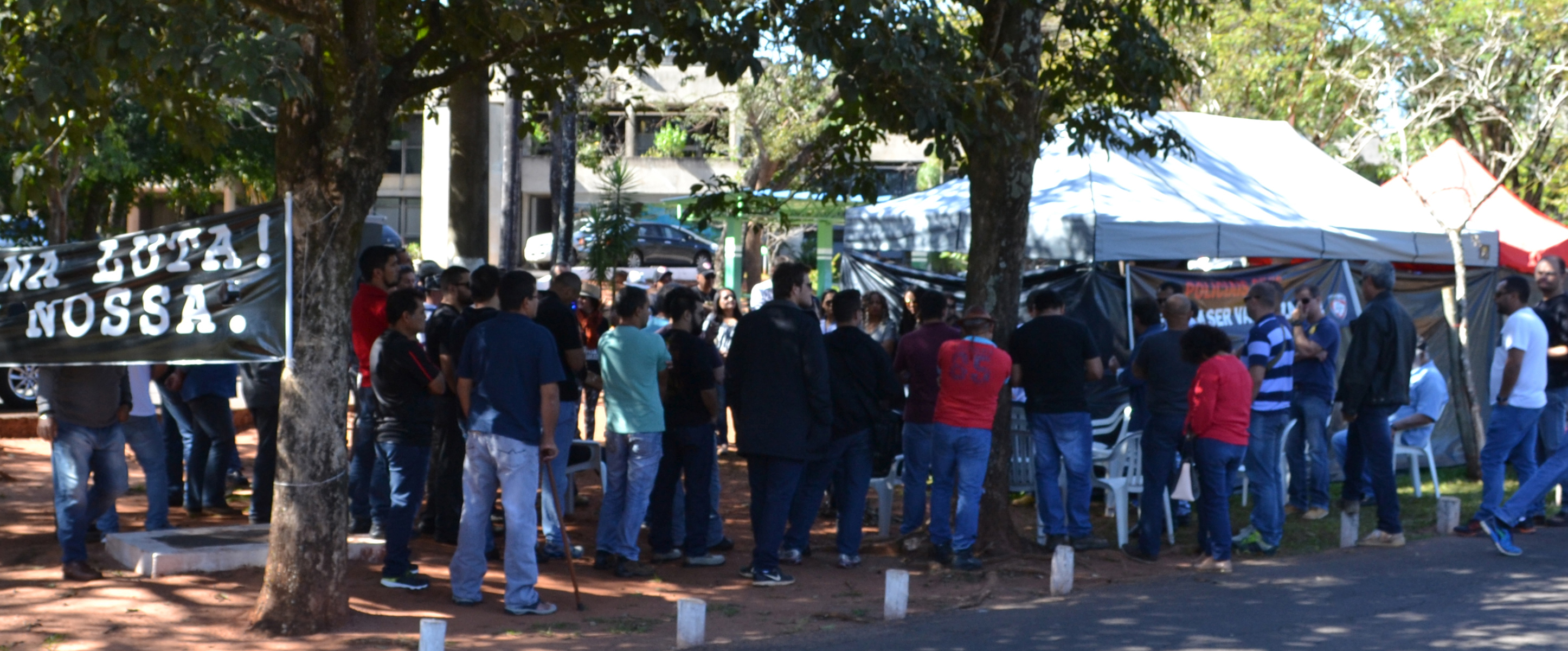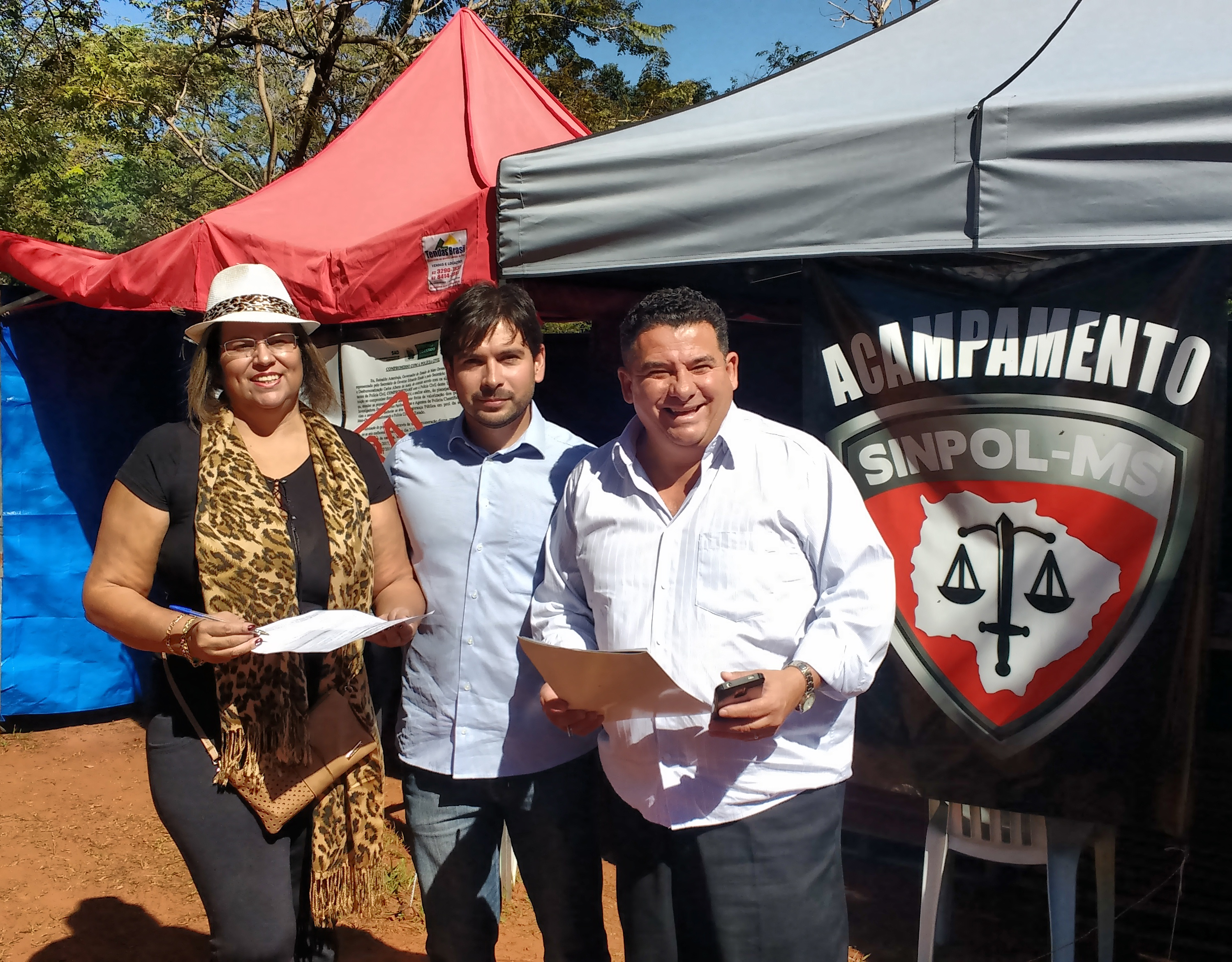 Na manhã desta sexta-feira (23), os policiais civis se reuniram para avaliar o desempenho do acampamento montado em frente à governadoria. O grupo avaliou que está sendo positivo para a categoria, pois a manifestação está ganhando o apoio da sociedade, de agentes políticos e até mesmo de outras entidades classistas. “Diariamente há um grande fluxo de colegas que se revezam no acampamento, de pessoas que frequentam o Parque dos Poderes e que manifestam seu apoio conversando conosco, buzinando com o carro e até mesmo trazendo um bolo para lancharmos. Isso mostra que estamos no caminho certo, a sociedade quer a valorização do policial civil, agora falta só o governo estadual querer também”, declarou o presidente do Sinpol-MS, Giancarlo Miranda. O sindicato destaca que apesar dos incessantes pedidos dos gestores públicos para que o acampamento fosse desmontado, o grupo permanecerá no local por tempo indeterminado até que o governo estadual apresente uma proposta que atenda os pleitos da classe e os compromissos firmados desde 2014.