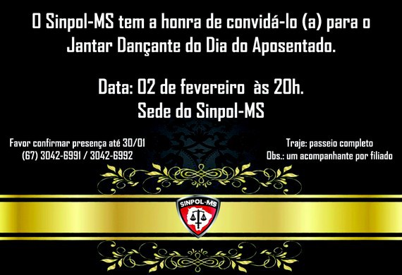 O Sinpol/MS reforça o convite a todos os filiados aposentados para participarem da tradicional comemoração do Dia do Aposentado, agendada para o dia 02 de fevereiro, às 20h, na sede da entidade, em Campo Grande. Será uma noite especial, com música ao vivo e um delicioso jantar.