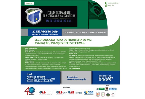 O evento tem a realização da Ordem dos Advogados do Brasil, seccional Mato Grosso do Sul, e apoio do Sinpol. “Os policiais civis estão em todas as fronteiras, combatendo diariamente o crime organizado, muitas vezes colocando a própria vida em risco como já aconteceu aqui no Estado. Um dos pontos para reforçar a segurança na fronteira é valorizar o policial que está lá, com salário digno e condições de trabalho”, declarou Giancarlo Miranda, presidente do Sinpol.