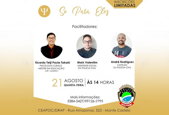 A Coordenadoria de Atendimento Psicossocial do Departamento Recursos e Apoio Policial (CEAPOC/DRAP) está organizando mais uma Roda de Conversa com o tema: Só Para Eles. O evento será conduzido pelo psicólogo Ricardo Teiji Paula Takaki; pelo assistente social da Polícia Civil, Mark Valentim; e pelo capelão da Polícia Civil, André Rodrigues.