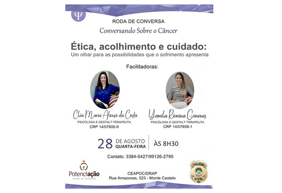 A Coordenadoria de Atendimento Psicossocial do Departamento Recursos e Apoio Policial (CEAPOC/DRAP) está organizando uma Roda de Conversa com o tema: Ética, Acolhimento e Cuidado: um olhar para as possibilidades que o sofrimento apresenta. O evento será conduzido pelas psicólogas e gestalt-terapeutas Cléa Maria Alonso da Costa e Yamila Romina Gimenes.