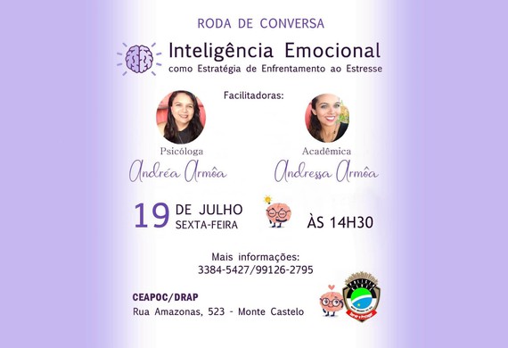 A Coordenadoria de Atendimento Psicossocial do Departamento Recursos e Apoio Policial (CEAPOC/DRAP) está organizando uma Roda de Conversa com o tema: Inteligência Emocional como Estratégia de Enfrentamento ao Estresse. O evento será conduzido pela psicóloga Andréa Armôa, e pela acadêmica Andressa Armôa.
