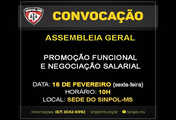 O Sinpol-MS convoca os filiados ativos e aposentados, da capital e do interior, para participarem da Assembleia Geral no dia 16 de fevereiro, às 10h, na sede da entidade em Campo Grande. De acordo com o presidente da entidade, Giancarlo Miranda, está é a retomada da Assembleia Geral Extraordinária que foi suspensa, em 09 de dezembro de 2017, para aguardar a resposta do governo sobre o enquadramento dos aposentados no projeto da promoção funcional.