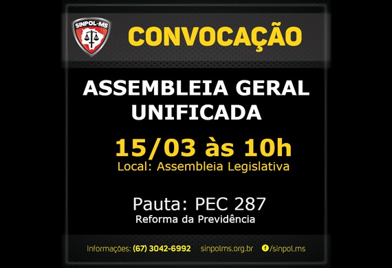 O Sinpol-MS convoca toda a categoria para uma assembleia unificada dos operadores da Segurança Pública que será nesta quarta-feira (15), às 10h, em frente à Assembleia Legislativa em Campo Grande. Em todo o Brasil, os policiais civis também se mobilizarão contra a reforma da Previdência, PEC 287/2016, que retira o direito da aposentadoria especial por atividade de risco dos policiais.