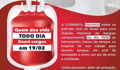Nesta quarta-feira, 19/02, haverá um Ato Nacional, organizado pela Cobrapol, para doação de sangue e o Sinpol convoca os policiais civis a comparecerem no Hemosul, na Av. Fernando Corrêa da Costa, nº 1304, no Centro, das 7h às 17h