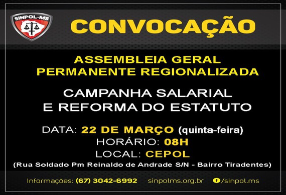 O Sinpol-MS convoca os filiados, ativos e aposentados, da regional de Campo Grande para participar da Assembleia Permanente Regionalizada nesta quinta-feira (22), às 8h, no Cepol. Para garantir a participação efetiva da categoria nas deliberações, decidiu-se realizar as Assembleias Regionalizadas e em locais de mais fácil acesso. “O objetivo é unir ainda mais a categoria, e lutarmos pela nossa valorização salarial tão merecida”, declarou o presidente do Sinpol-MS, Giancarlo Miranda. Em breve será divulgado o calendário das assembleias no interior do estado.
