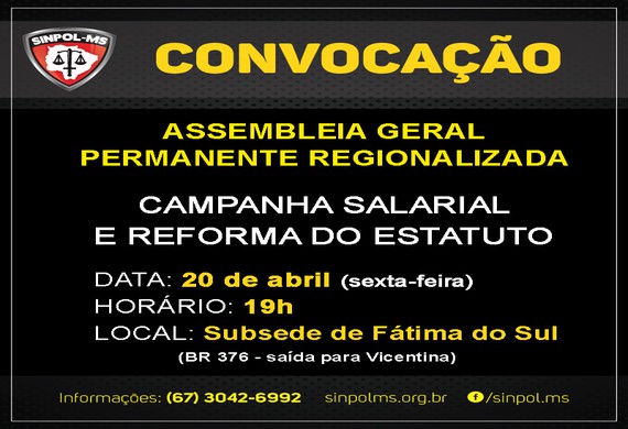 O Sinpol-MS convoca os filiados, ativos e aposentados, da regional de Fátima do Sul para participar da Assembleia nesta sexta-feira (20), às 19h, na subsede do sindicato, localizada na BR 376, saída para Vicentina. O Sinpol-MS está realizando assembleias regionalizadas para garantir a participação efetiva da categoria nas deliberações.