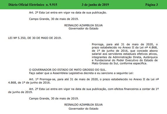 O governador Reinaldo Azambuja (PSDB) decretou hoje o abono salarial aos servidores estaduais efetivos ativos, até 31 de maio de 2020. Segundo publicação no DOE (Diário Oficial do Estado) desta segunda-feira (3), após a Assembleia Legislativa decretar, Azambuja sancionou a Lei, prorrogando por mais um ano, o abono salarial que pode chegar até R$ 200.
