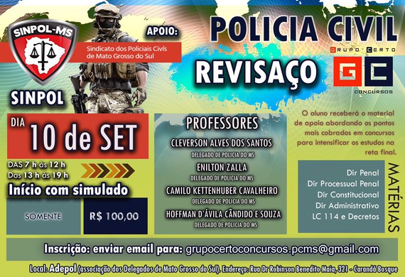 O Sinpol-MS oferece aos dependentes de seus filiados um aulão gratuito preparatório para o concurso da Polícia Civil. Será no próximo domingo (10), das 7h às 19h, na sede da Adepol em Campo Grande. Para participar é preciso se inscrever pelo telefone: (67) 3042-6992. As vagas são limitadas!