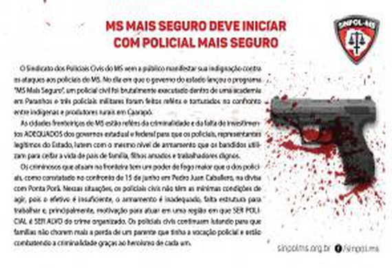 O Sinpol-MS publicou na edição desta sexta-feira (17) dos jornais Correio do Estado e O Estado uma nota com o título “MS Mais Seguro deve iniciar com Policial Mais Seguro”. No texto, o sindicato demostra sua indignação contra os ataques aos policiais do MS, a falta de investimentos adequados dos governos estadual e federal para que os policiais lutem com o mesmo nível de armamento que os bandidos utilizam para ceifar a vida de pais de família, filhos amados e trabalhadores dignos. Confira na imagem o material publicado.