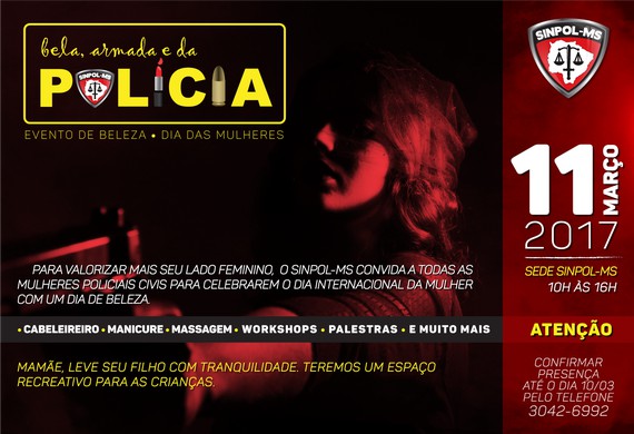 “Bela, armada e da Polícia” – esse é o nome da primeira festa em homenagem às mulheres, que será realizada no dia 11 de março, das 10h às 16h, na sede do Sinpol. O objetivo do evento é valorizar as policiais civis e proporcionar um dia de cuidados de beleza para todas as filiadas do sindicato. Serão oferecidos: cabeleireiro, manicure, massagem, workshops, palestras, além de sorteio de vários prêmios.