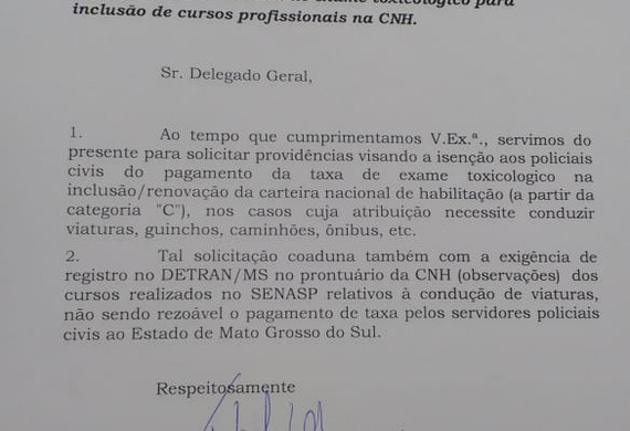 Nesta quinta-feira, 17, o diretor de Assuntos Trabalhistas do Sinpol, Tony Messias Lopes Medeiros, protocolou um ofício, junto à Delegacia Geral da Polícia Civil, solicitando a isenção da taxa de exame toxicológico para inclusão de cursos profissionais na Carteira Nacional de Habilitação, a partir da categoria “C”, nos casos em que a atribuição do policial já é a de conduzir viaturas, guinchos, caminhões e ônibus oficiais.