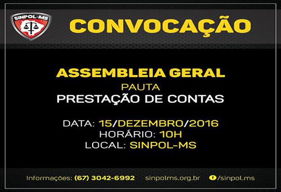 Na próxima quinta-feira, dia 15 de novembro, a partir das 10 horas da manhã, será realizada mais uma Assembleia Geral na sede do Sinpol/MS. Durante o encontro será apresentada a prestação de contas de 2016.